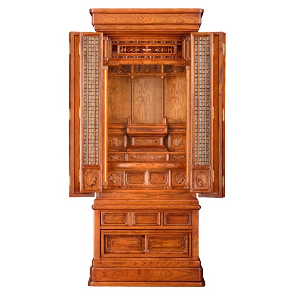 お仏壇の表面仕上げに定評のある工場で製作しており、欅材の杢目の選定、杢目合わせも入念に行っています。